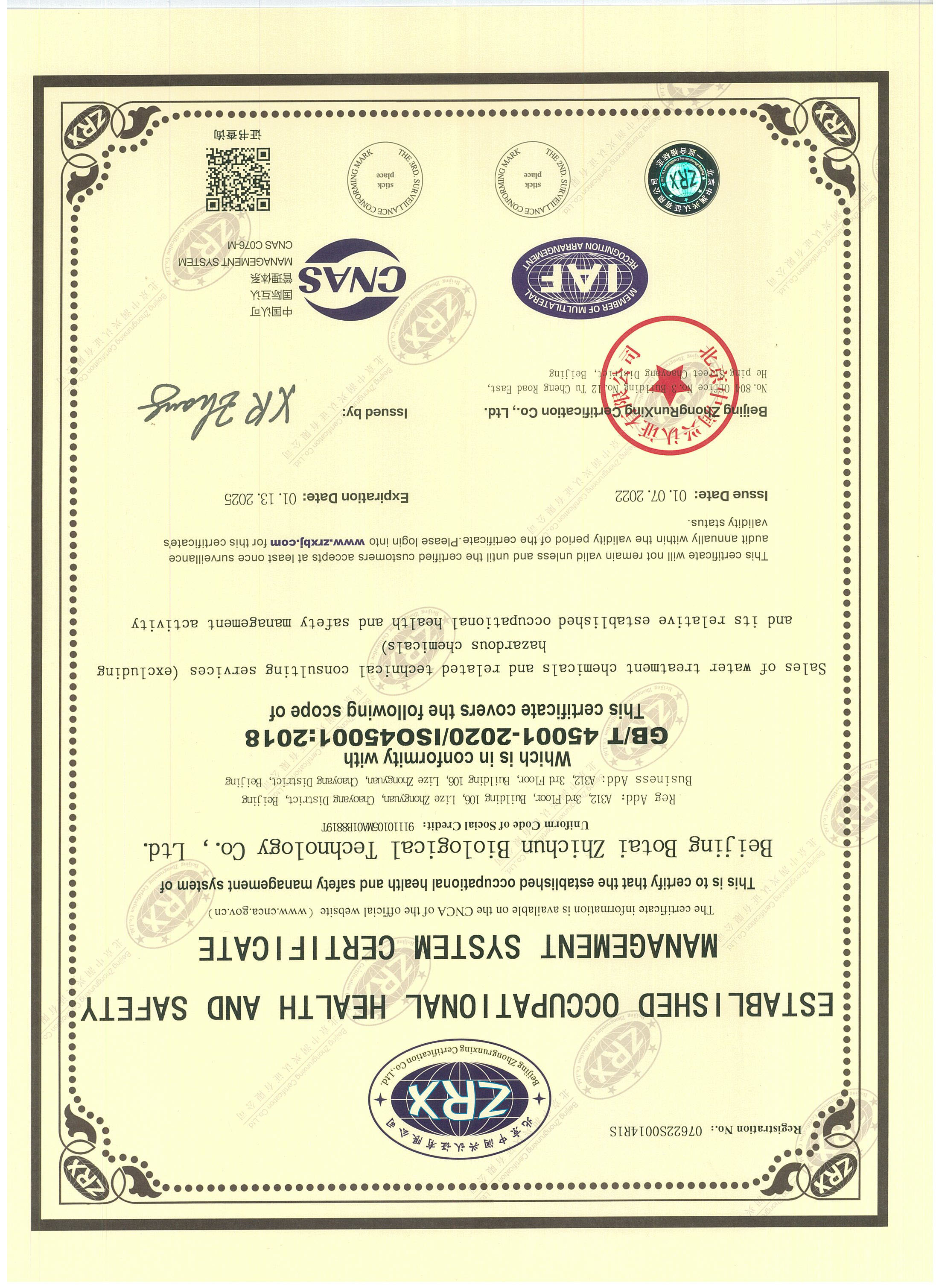 Established Occupational Health & Safety Management System Certificate