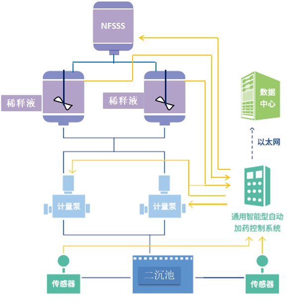 NAAS(Automatic Adding System for NFSSS)為NFSSS絮凝劑自動(dòng)投加系統(tǒng)的簡(jiǎn)稱。NAAS系統(tǒng)主要由在線流量計(jì)、在線污泥濃度計(jì)、在線泥位計(jì)、在線濁度儀、在線液位計(jì)、PLC自控系統(tǒng)、變頻器等組成。NAAS系統(tǒng)可實(shí)現(xiàn)NFSSS絮凝劑的自動(dòng)配藥、在線監(jiān)測(cè)及自動(dòng)投加功能。