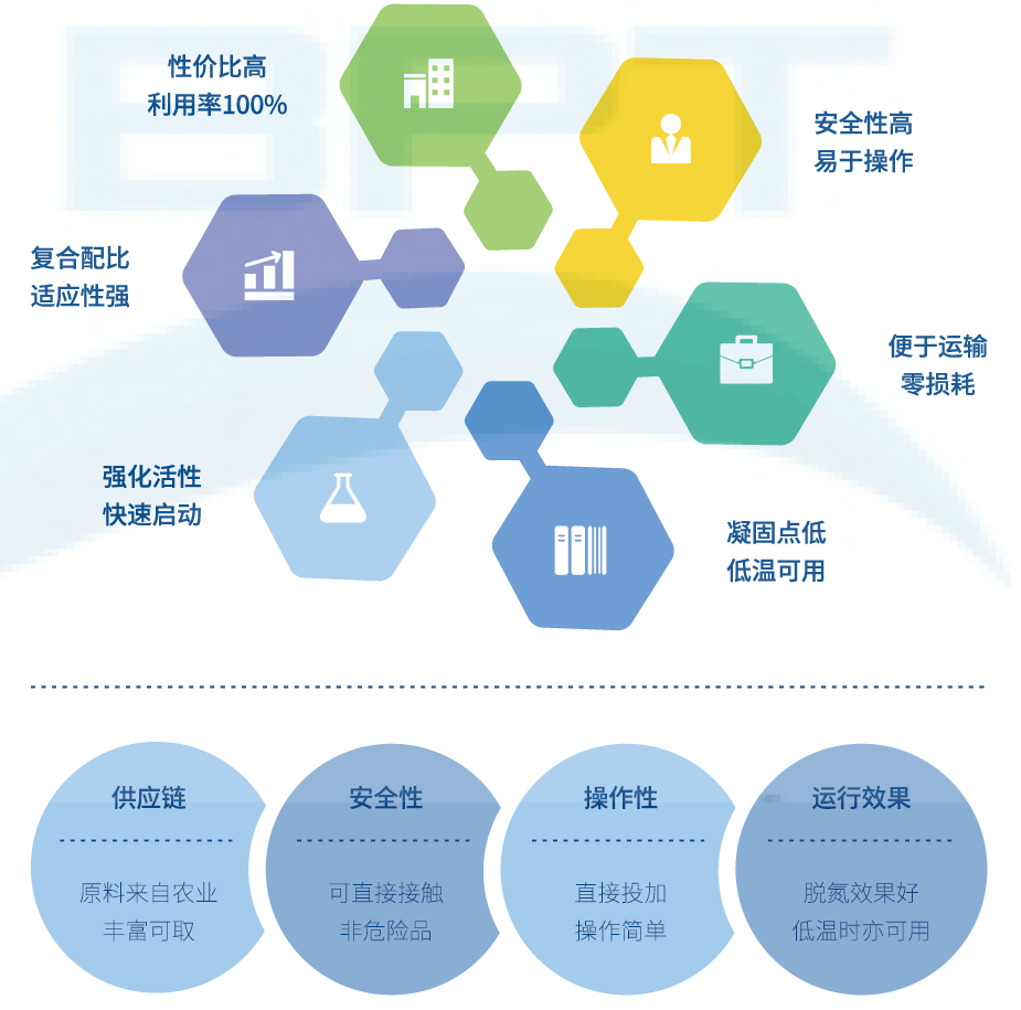 BioC-1M碳源是北京博泰至淳生物科技有限公司自主研發(fā)的專有產(chǎn)品,作為高效的外補碳源,在污水處理廠碳源不充足時,為生物處理系統(tǒng)中的細菌提供能量來源。該產(chǎn)品廣泛應(yīng)用于反硝化脫氮、強化生物除磷及生化系統(tǒng)快速啟動,特別適用于污水處理廠排水標準由一級A提標至地表準Ⅳ類的改造需求。