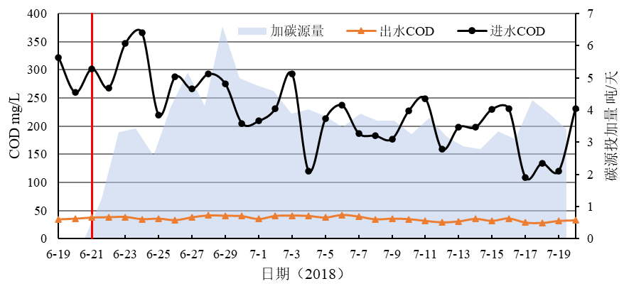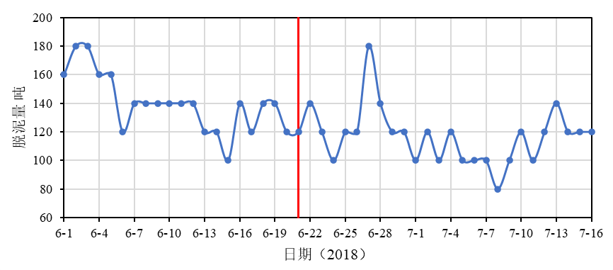 由圖2可知,更換碳源之前的6月1號-6月21號,污泥脫水間平均日脫水泥水為139.0噸,更換BioC-1M碳源后6月22號-7月16號,污泥脫水間平均日脫水泥水為116.8噸,減量化明顯。更換BioC-1M碳源后污泥減量在16%