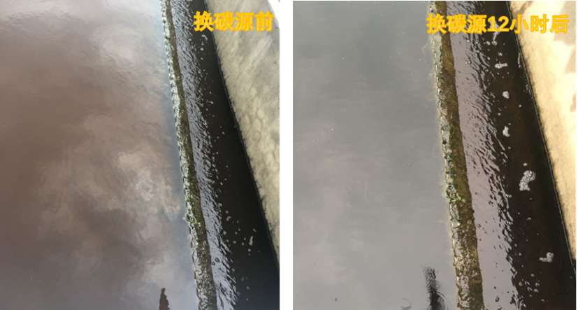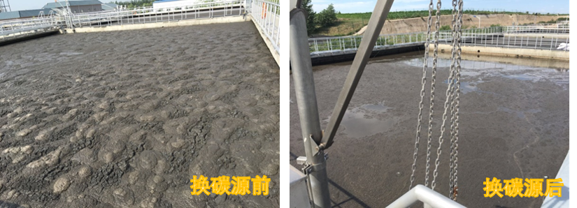 由圖3圖4可以看出,更換碳源后二沉池泥位明顯降低,并且缺氧池表面死泥明顯變少。