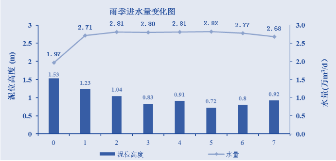 通過上述方案,雨季最高水量高達(dá)8.4萬m3/d,處理能力提高了1.68倍。二沉池出水澄清,出水持續(xù)達(dá)標(biāo)。