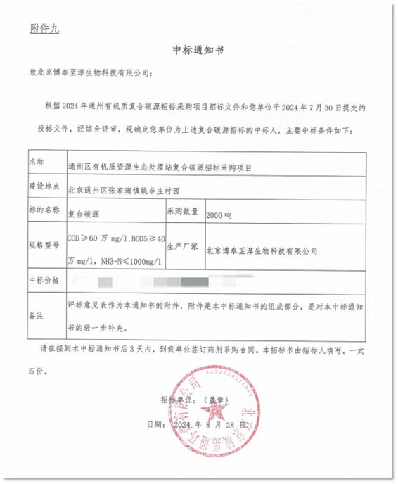 近日,博匯特藥劑板塊子公司北京博泰至淳生物科技有限公司(以下簡(jiǎn)稱“博泰至淳”)憑借BioC-1M復(fù)合碳源成功中標(biāo)通州區(qū)有機(jī)質(zhì)資源生態(tài)處理站復(fù)合碳源招標(biāo)采購項(xiàng)目重大項(xiàng)目。此次中標(biāo)不僅是對(duì)博泰至淳長(zhǎng)期以來致力于技術(shù)創(chuàng)新和服務(wù)優(yōu)化的認(rèn)可,更是對(duì)其推進(jìn)生態(tài)文明建設(shè)、助力水處理行業(yè)綠色發(fā)展的重要肯定。